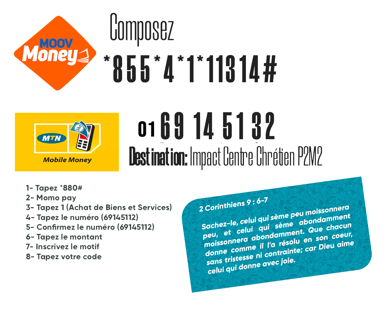 Lorsque vous donnez, faites-le en toute conscience et liberté, avec joie, sans contrainte, ni regret (2 Corinthiens 9:7)